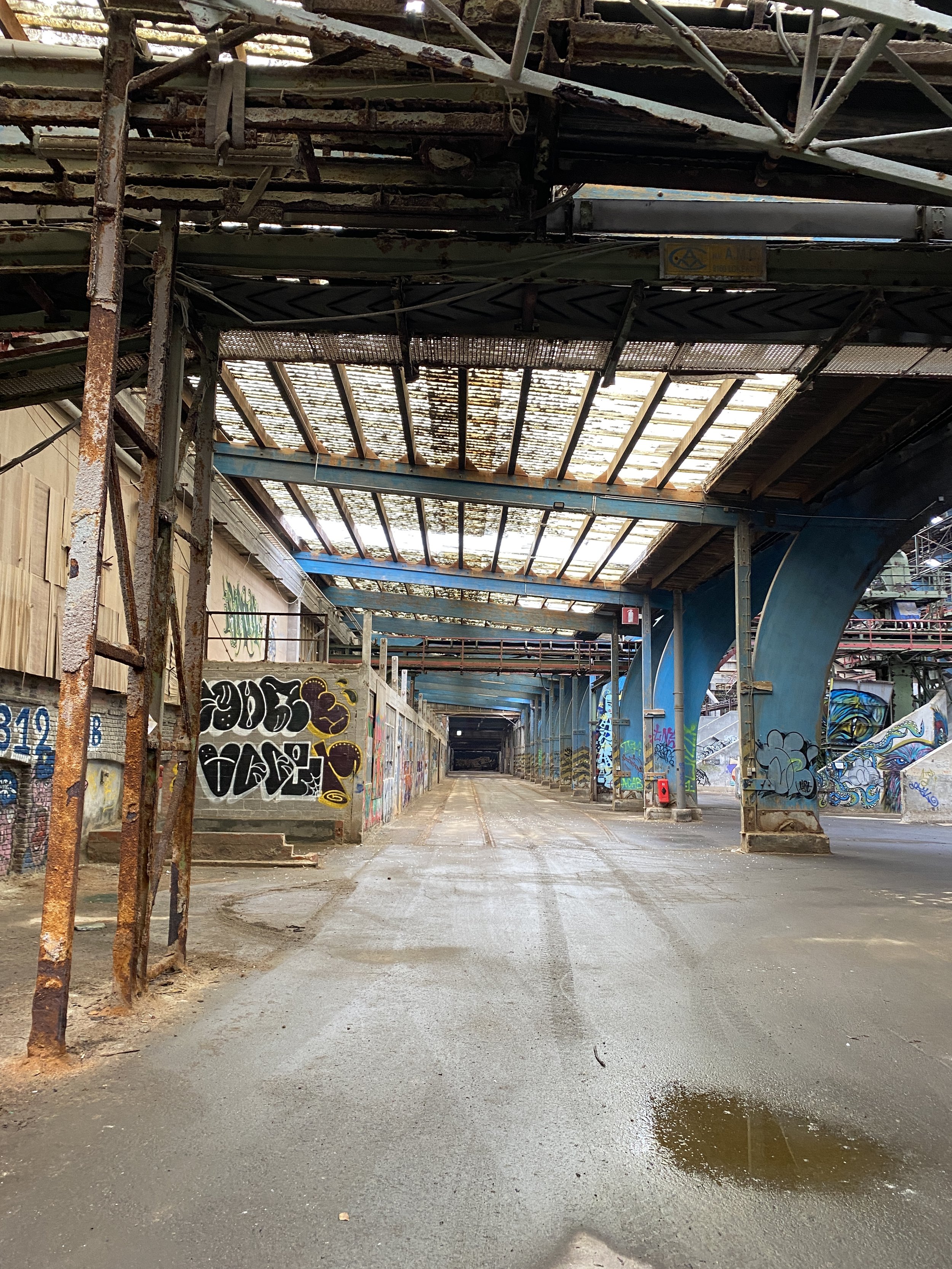 een enorme, industriële binnenruimte met een rauwe uitstraling en tal van graffiti-achtergronden